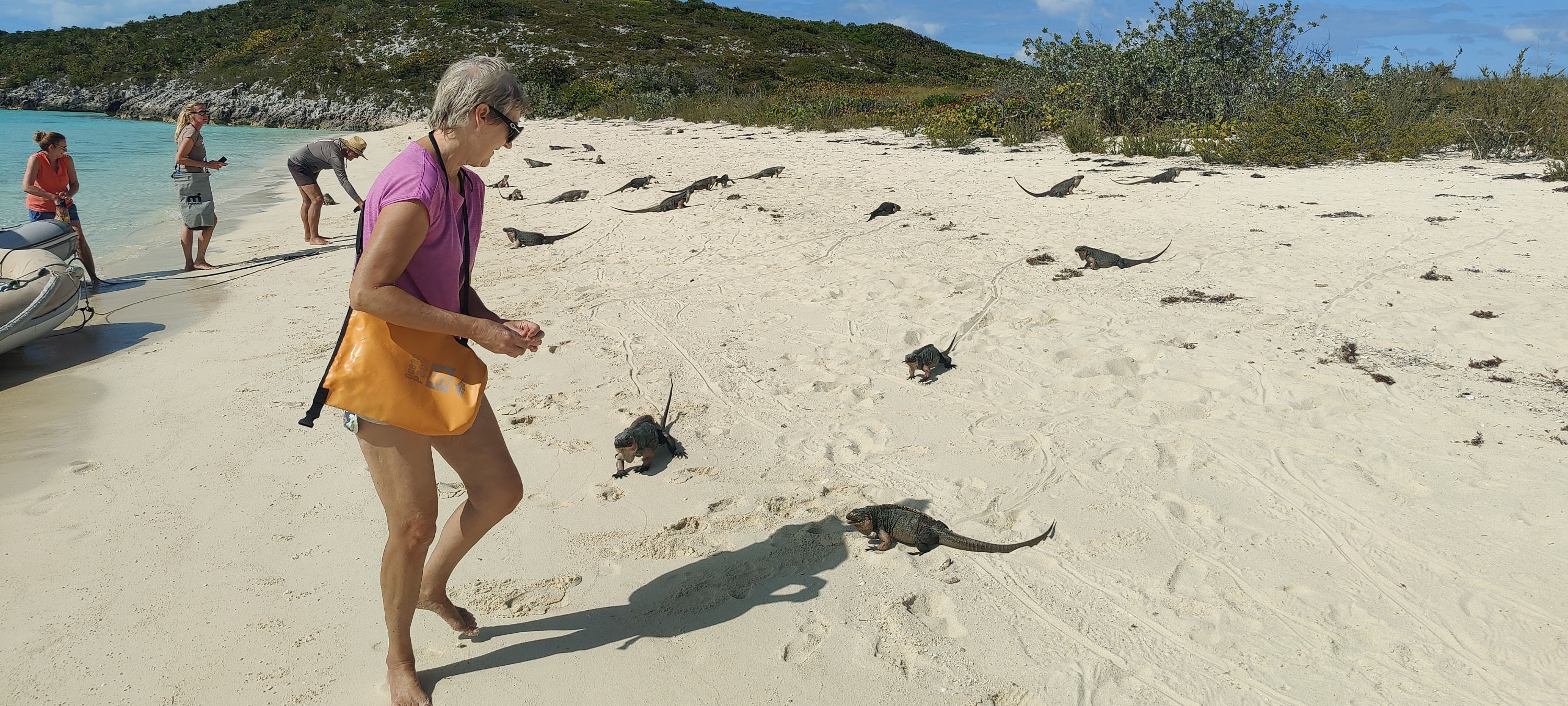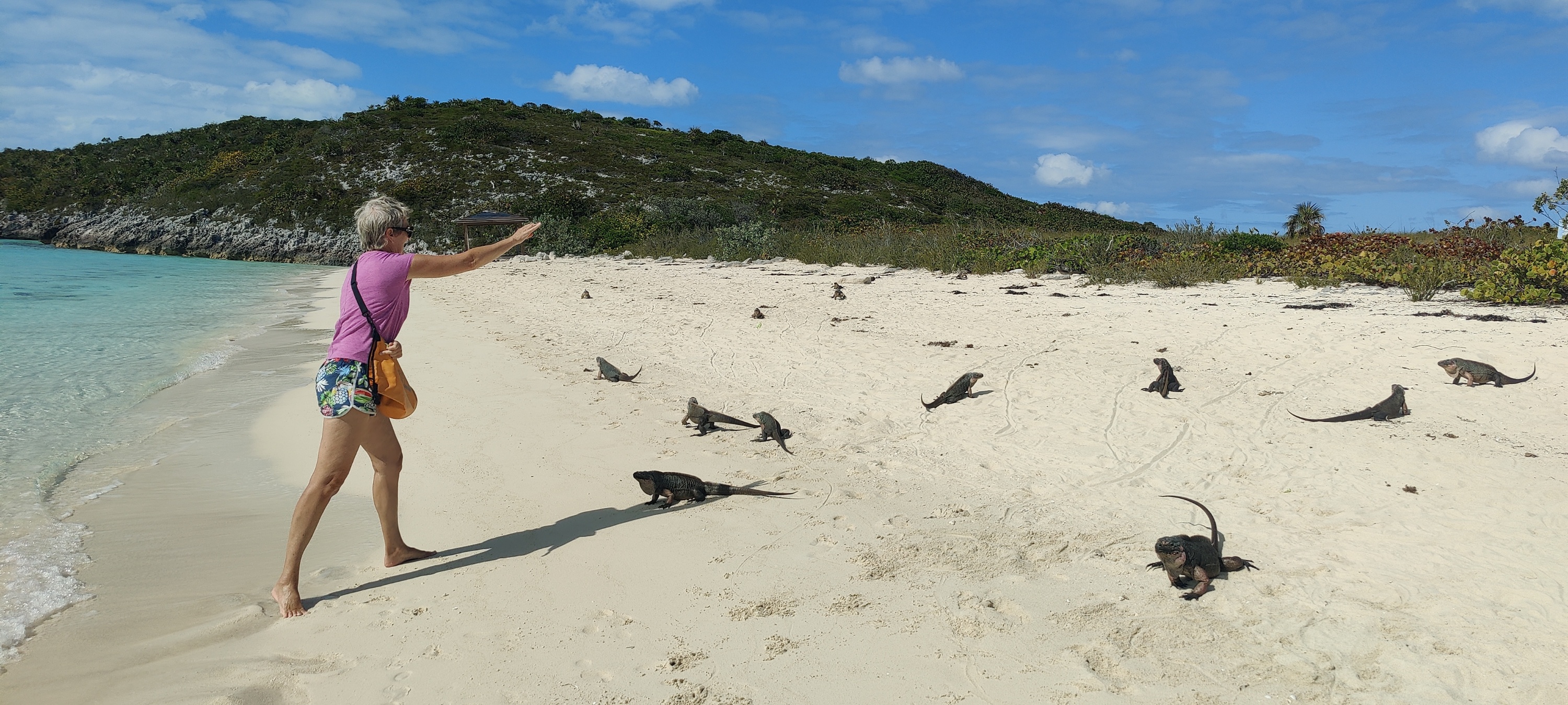 Neben der Thunderball Grotte und den Schweinen sind die Leguane an einem einsamen Strand eine weitere Attraktion. Die alten Salatblätter sind begehrtes Futter, da geht die Post ab.