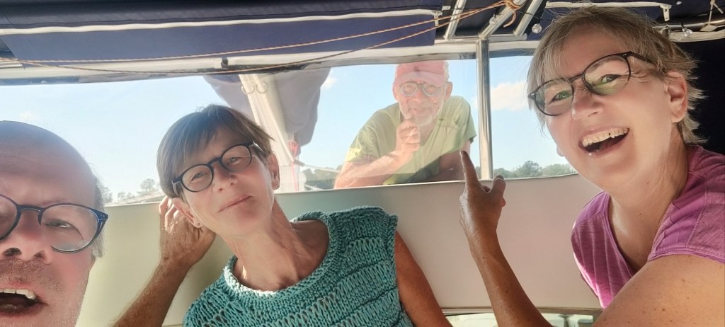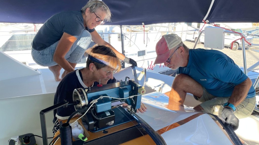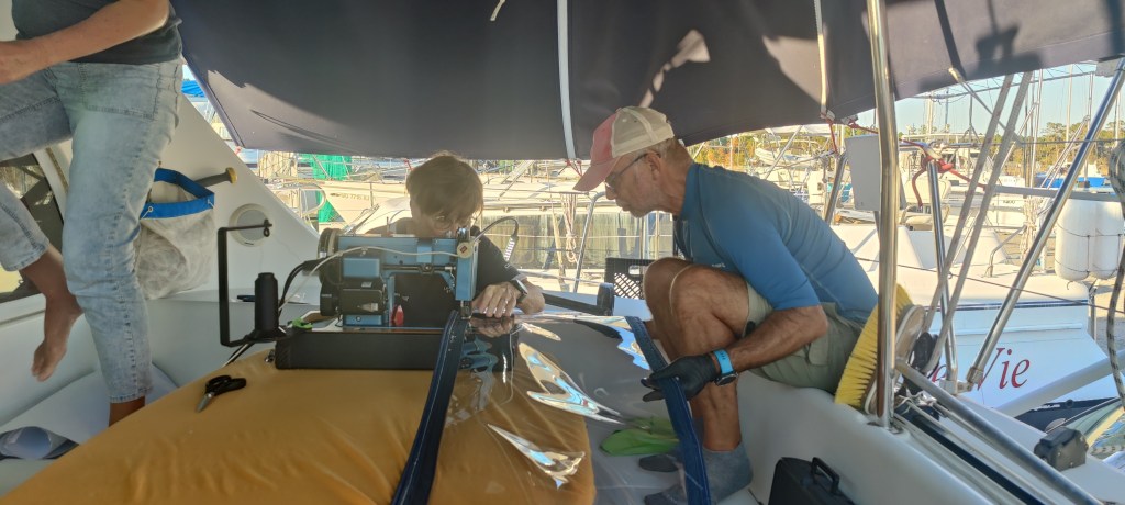 Es gab einiges zu nähen. Die iCat hat eine professionelle Nähmaschine. Damit haben wir in gemeinsamer Aktion die Scheibe für unser Verdeck erneuert.