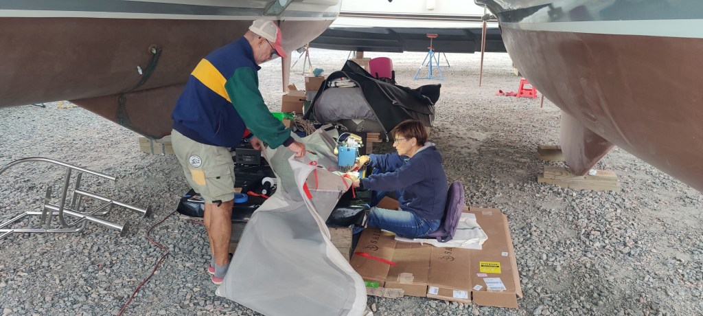 Jetzt fängt so langsam das Bootsleben an. Wir liegen am Kai und erledigen noch die restlichen Arbeiten. Die Segel werden wieder montiert. Der reparierte Toprutscher für das Großsegel eingesetzt und das Großsegel wieder montiert.