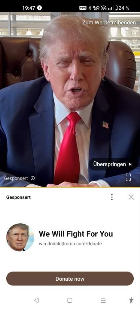 Das alles poppt auf, wenn man hier Youtube startet. Die Kandidaten werben um Spenden. Die Kandidaten? Kamala ist bisher kaum bei mir aufgepoppt. Warum???? Soweit zum ruhigen Verlauf der Wahl. In den etwas größeren Städten (zB Greenville) in NC sieht man viele Kamala Plakate, sonst meistens Plakate der Republikaner. Wir sind auf dem Lande.