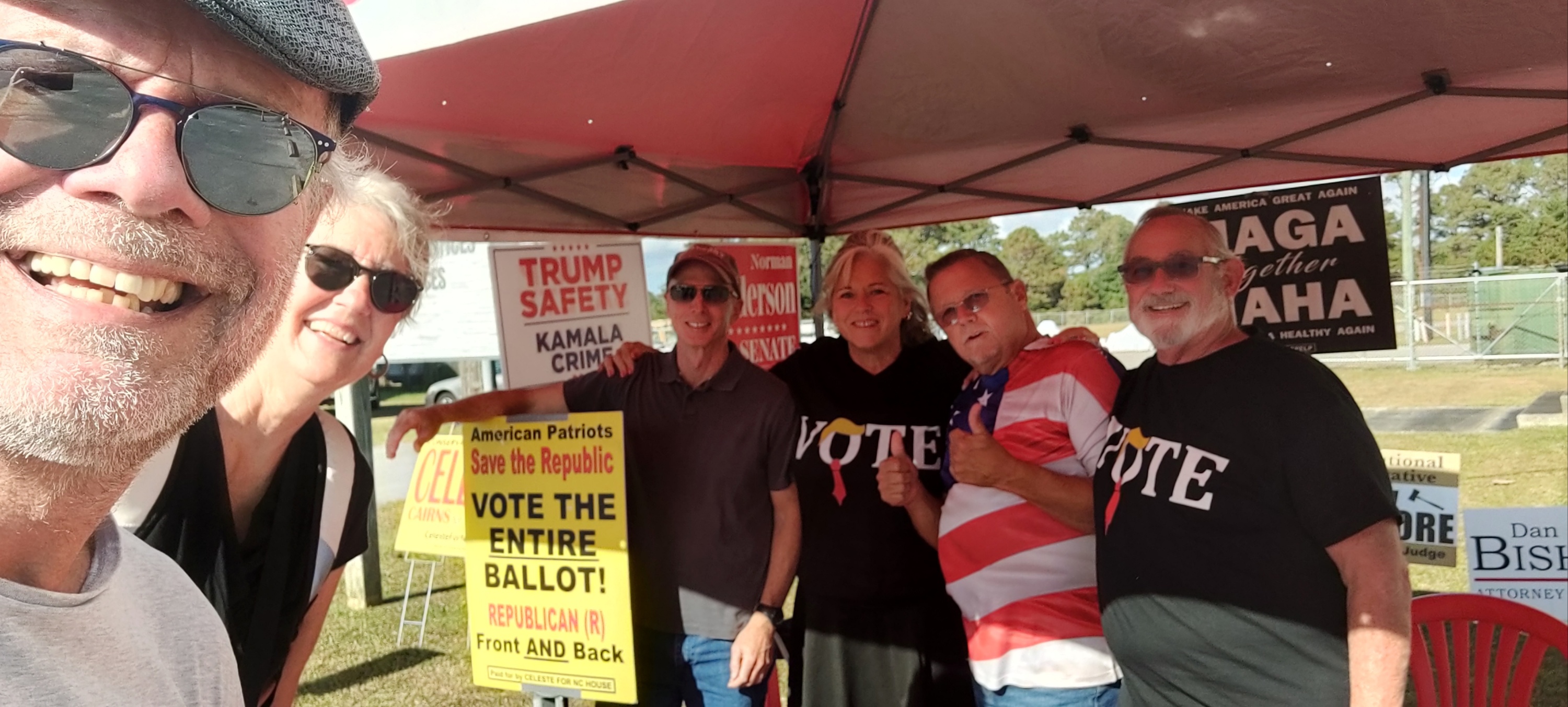 Wir gehen zuerst zu den Konservativen und quatschen drauflos. Sehr nette Leute, Heidi ist in Baden Baden geboren. Ihr Vater war Verbundungsoffizier bei der Army. Wir fragen ihnen Löcher in den Bauch, auch wegen Trump. Sie sagen Trump ist kein Politiker, den sie als Mensch mögen. Aber er steht mit seinem Team für das was ihnen wichtig ist. Und das ist vorrangig Wohlstand und Sicherheit. Beides ist in den USA nicht so selbstverständlich wie in Europa. Die Teuerungswelle seit 4 Jahren macht allen zu schaffen.