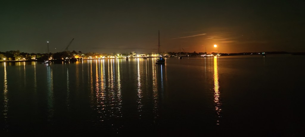 Es wird eine sehr ruhige Fahrt. Gegen 21-22 Uhr passieren wir das Ankerfeld vor Savanna. Da liegen Tanker und Containerschiffe auf Reede und manchmal kommen neue Schiffe dazu oder es fährt eins aus dem Hafen raus. Ich bin immer froh wenn wir da durch sind, obwohl es auf der Anzeige immer viel enger aussieht als in der Realität. Aber in der Dunkelheit ist es doch immer sehr spannend. Der Vollmond begleitet uns diese Nacht von wolkenlosem Himmel. Das ist einfach klasse.⛵