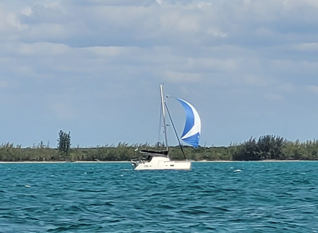 Das ist unser Lieblingssegel. Leicht in der Handhabung und das Boot zieht ruhig dahin. Gut, es knallen ein paar Wellen gegen den Rumpf, aber wir können recht entspannt durchsegeln. Erst kurz vor Eleuthera nehmen wir den Spinnaker weg, rollen die Genua aus und fahren mit Unterstützung eines Motors zum Inlet bei Egg Island. Kurz nach uns sind noch 8 (!) andere Boote los, es ist schön diese Flottille im Heck zu sehen.