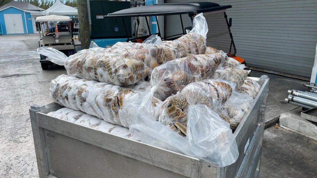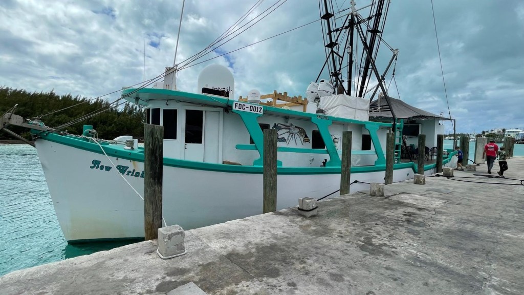 Dazu haben sie die von uns gesehenen kleinen Motorboote im Schlepptau. Von denen gehen die Taucher auf Fang, bis ca 10 m Tiefe. Die Lobster werden direkt an Bord gesäubert und auf Eis gefroren. Spanish Wells ist die Lobster-Hauptstadt. Er erzählt, so gut wie dieses Jahr hatte er noch keine Saison erlebt, Unmengen an großen Lobstern. Man glaubt es ihm gerne, denn er und seine Crew tragen ordentlich Goldschmuck und haben sichtlich gute Laune.