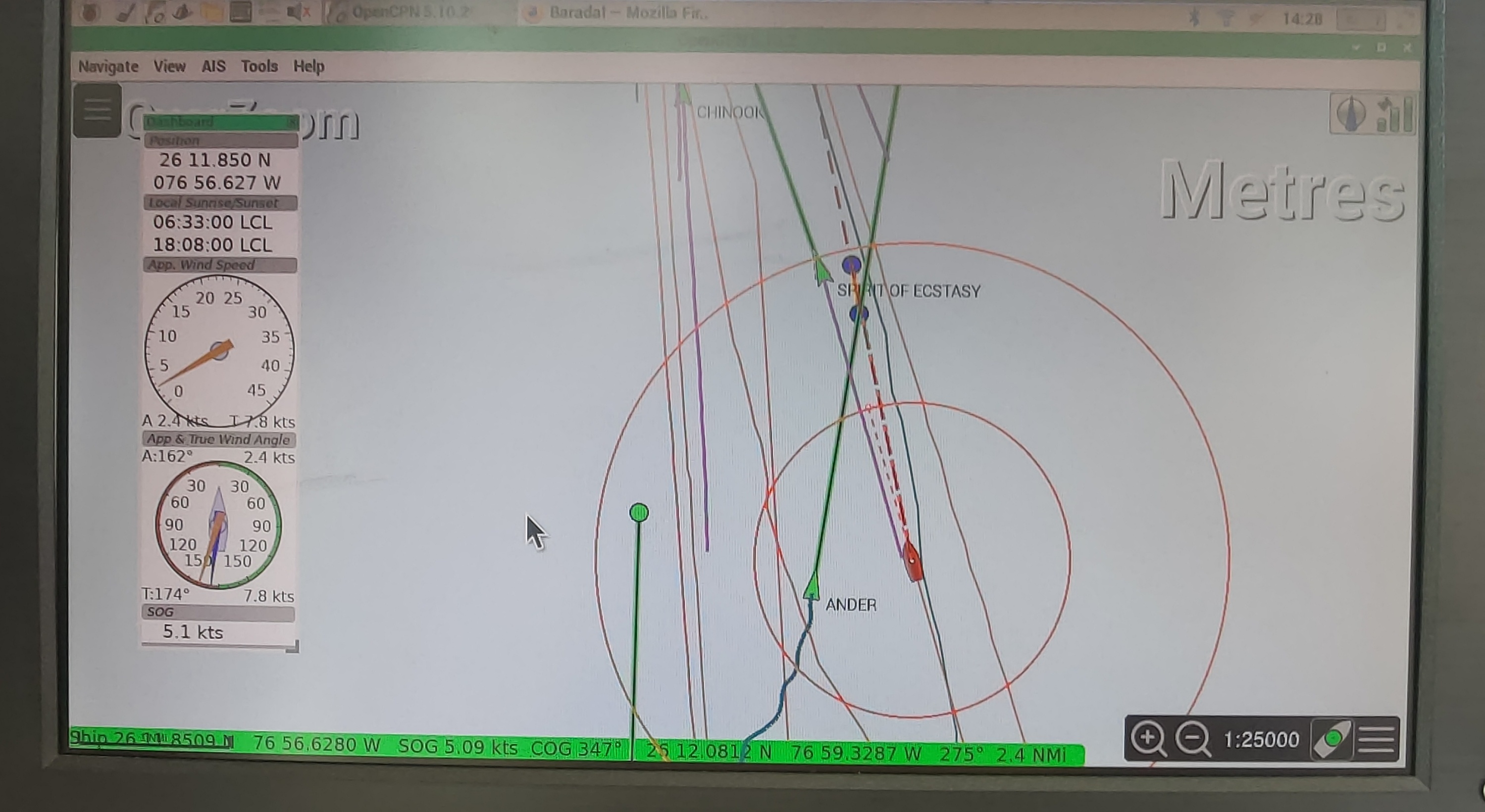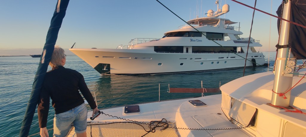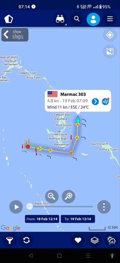 Tja, so ist es mit Wetter-Vorhersagen🙈 wir starteten ja früh um kurz nach 6 Uhr. Es sind über 50 nm. Das dauert ca. 8 – 10 Stunden, je nach Wind. Und so fahren wir bei bestem frühen Sonnenschein an Yachten vorbei und durch die Korallenbänke auf den Atlantik raus. Aber aus der geplanten Fahrt unter Spinnaker wird ein Gebrumme unter Motor. Bestimmt 10 anderen Booten geht es nicht besser. Kurz vor Abacos sehen wir das Tankschiff Ander erst im AIS, dann immer näher kommend. Ich funke es an und frage mal: wie wollen wir aneinander vorbei? Offiziell haben wir Vorfahrt, aber man weiß nie . . .