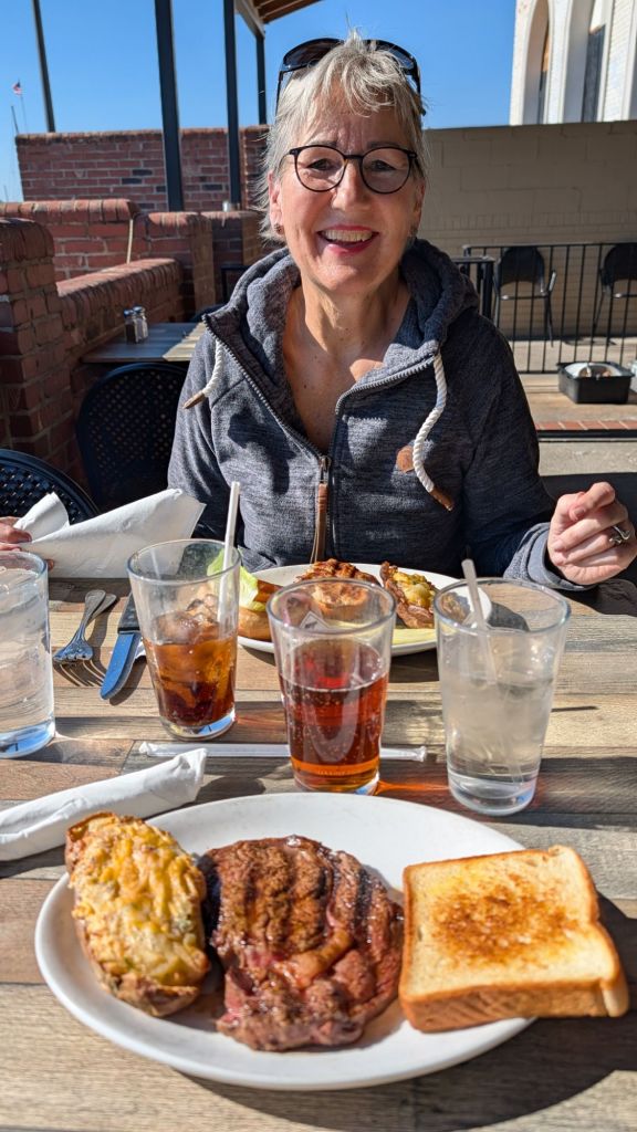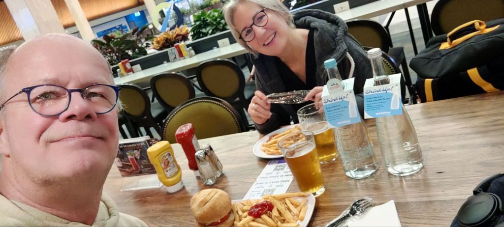 In Norfolk, NC kam am Gepäckband leider nix an und die nette Dame von „lost and found“ meinte, dass unsere Taschen wahrscheinlich mit dem nächsten Flieger kämen. Also knapp 3 Stunden warten. Wir genehmigen uns ein Bier und Burger.