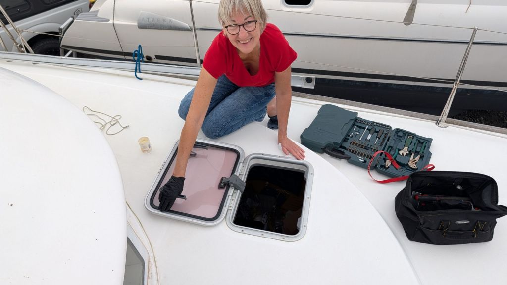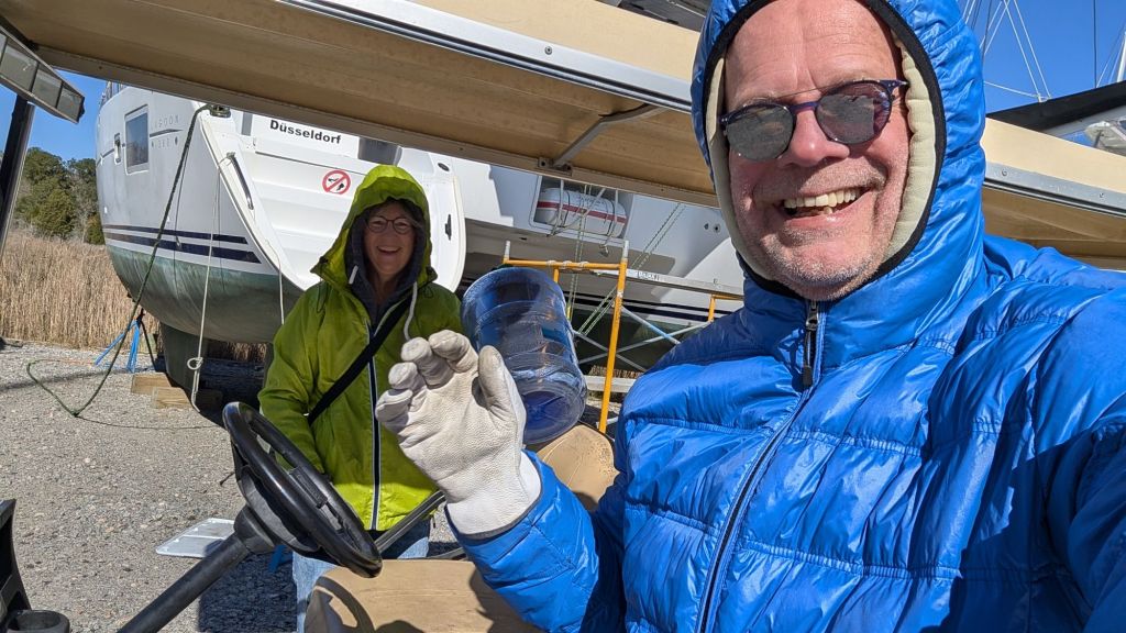 Jetzt wuseln wir uns durch all die Arbeiten durch, damit wir wieder zügig ins Wasser können. Das Wetter ist gnädig, aber es ist teilweise empfindlich kalt. Heute Nacht hatten wir Frost. Aber mit der strahlendem Sonne lässt es sich trotzdem gut aushalten.