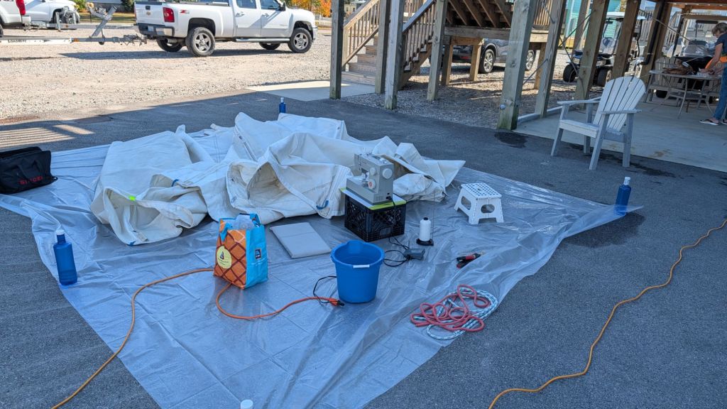 Wir haben kräftig zu tun. Das Boot ist sehr grün, der Sommer war wohl feucht. Aber innen ist alles gut, kein Schimmel, denn der kleine Lufttrockner hat über die Monate gut funktioniert.